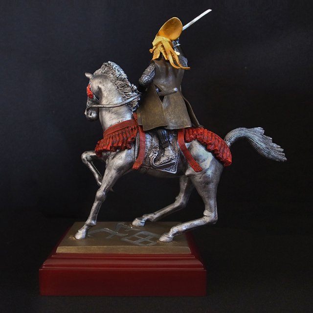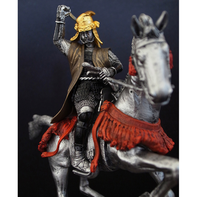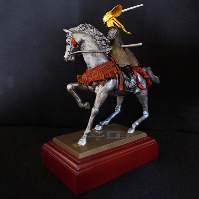 逸話が残されています。本像は一騎打ちの場面を連想させる、躍動的な騎馬姿を見事に捉えた武将像です。
