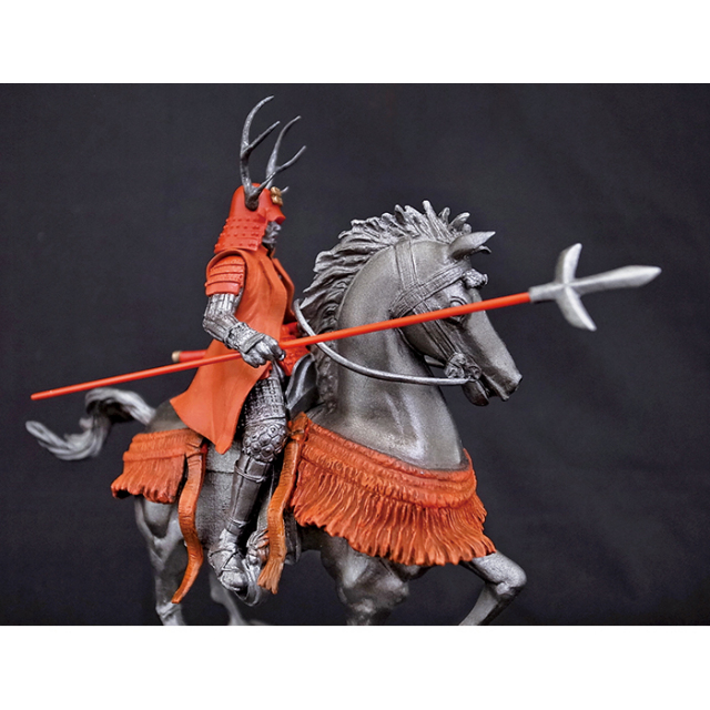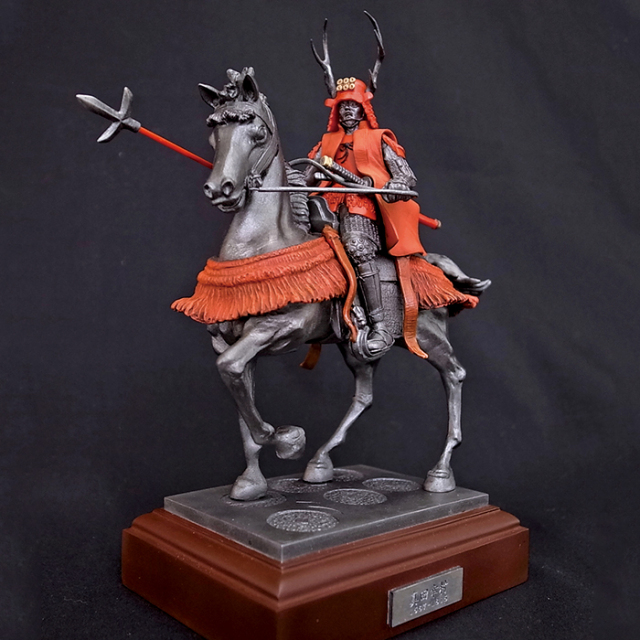 と記録されております。史料にも記録が残る赤の鎧一式に、鹿角の兜、十文字槍などを精巧に立体